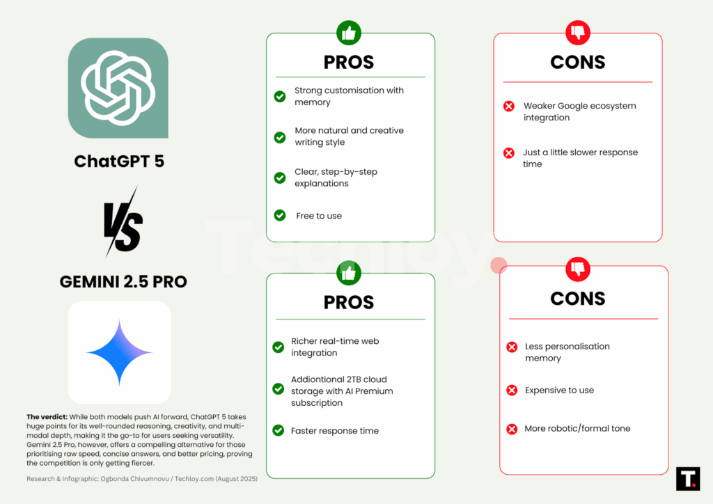 Comparison of ChatGPT 5 and Google’s Gemini 2.5 Pro outlining their pros, cons, and key features.