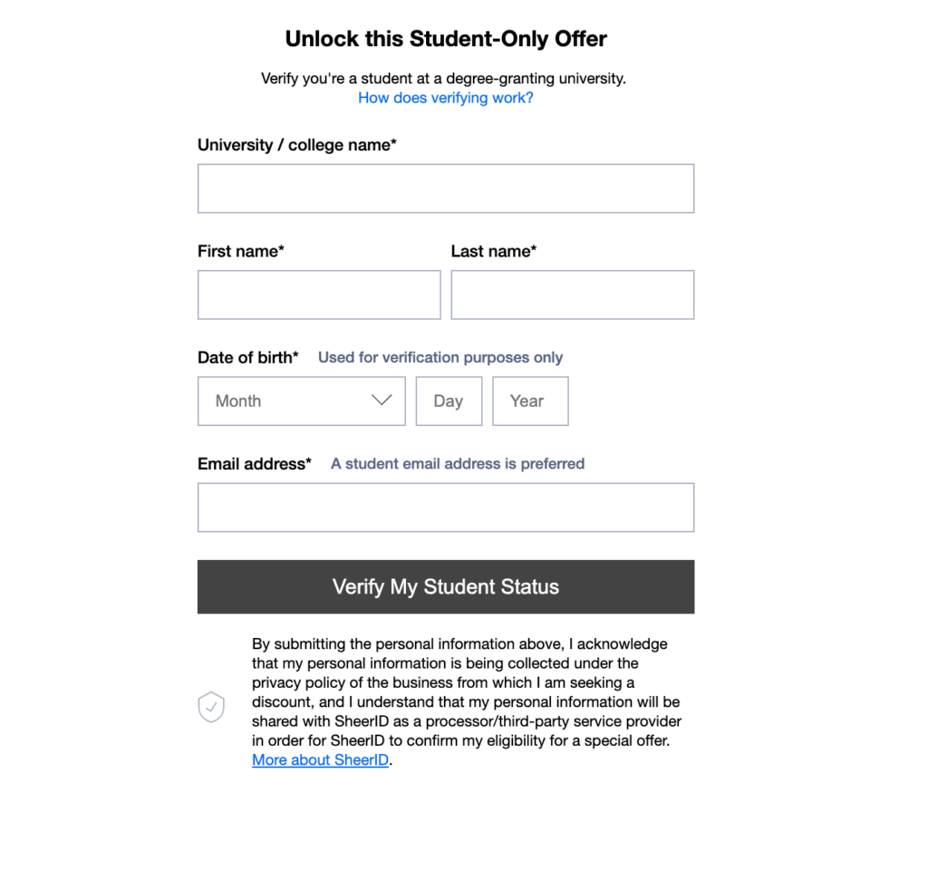 Screenshot of the SheerID student verification form used to confirm eligibility for student-only offers by verifying university enrollment and personal information.