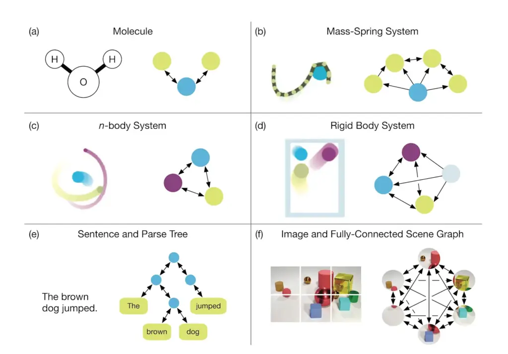 Illustrations showing different systems (molecule, mass-spring, n-body, rigid body) and their corresponding graph representations including sentence parsing and image scene graphs.