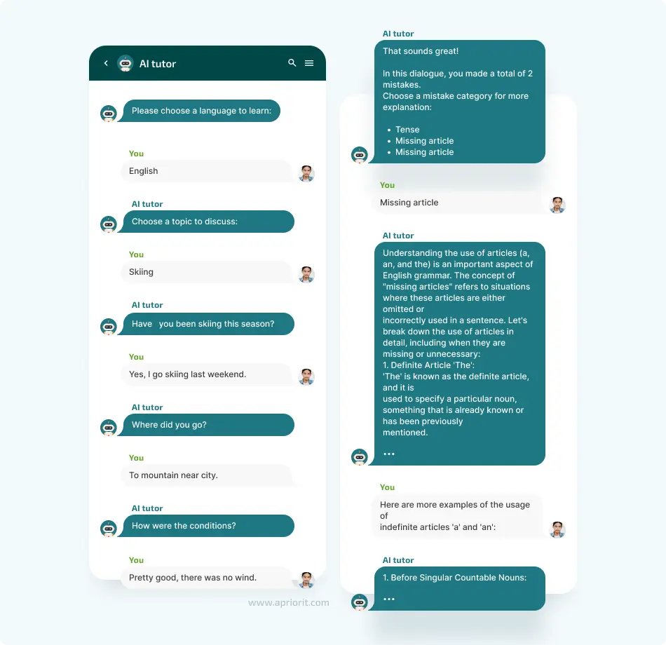 Example of an AI language tutor providing interactive guided learning and grammar feedback in an English conversation.